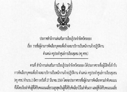 ประกาศรายชื่อผู้ผ่านการคัดเลือกบุคคลเพื่อจ้างเหมาบริการเป็นพนักงานจ้างปฏิบัติงาน ตำแหน่ง ครูประจำศูนย์การเรียนรู้ชุมชน (ครู ศรช.)